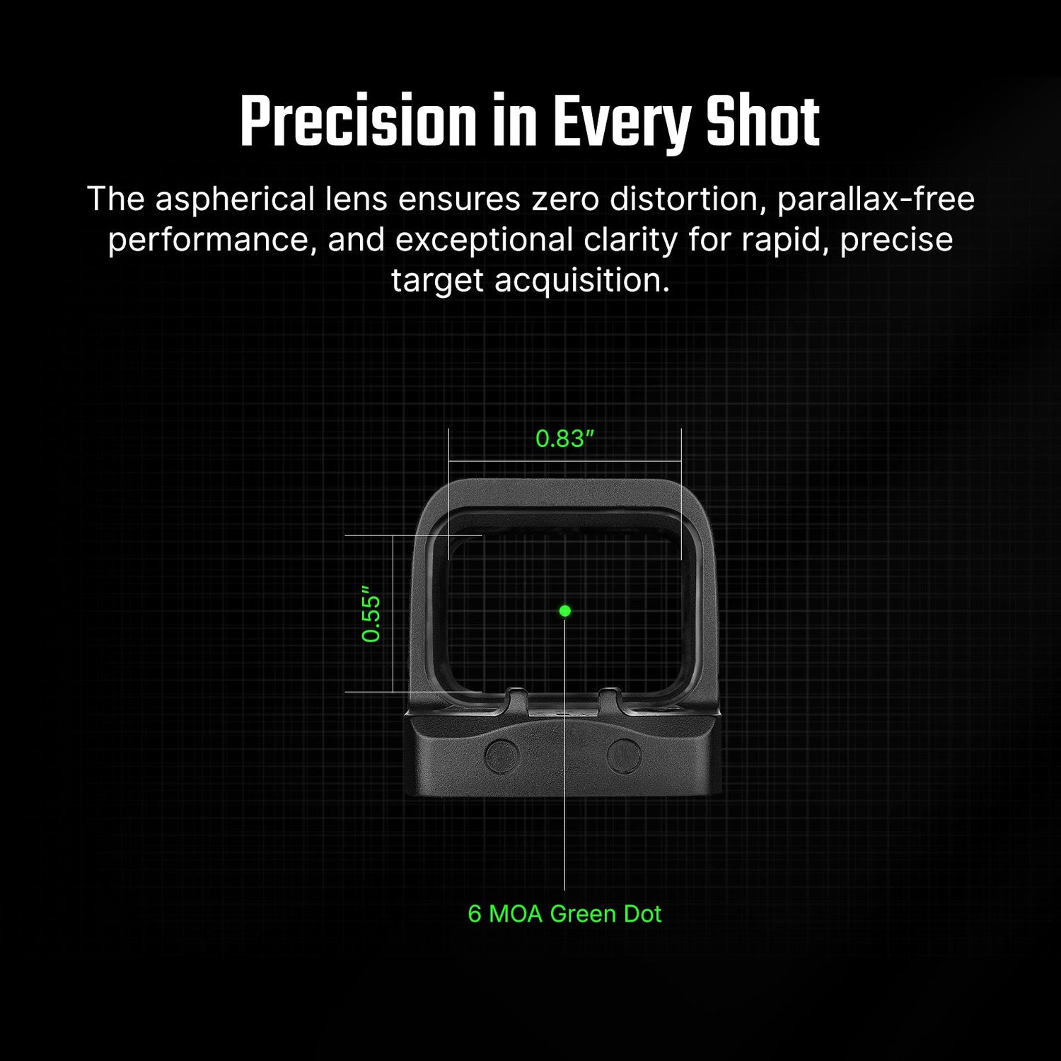 • Asferische Lens: De asferische lens zorgt voor nul vervorming, parallaxvrije prestaties en uitzonderlijke helderheid voor snelle, precieze doelacquisitie.